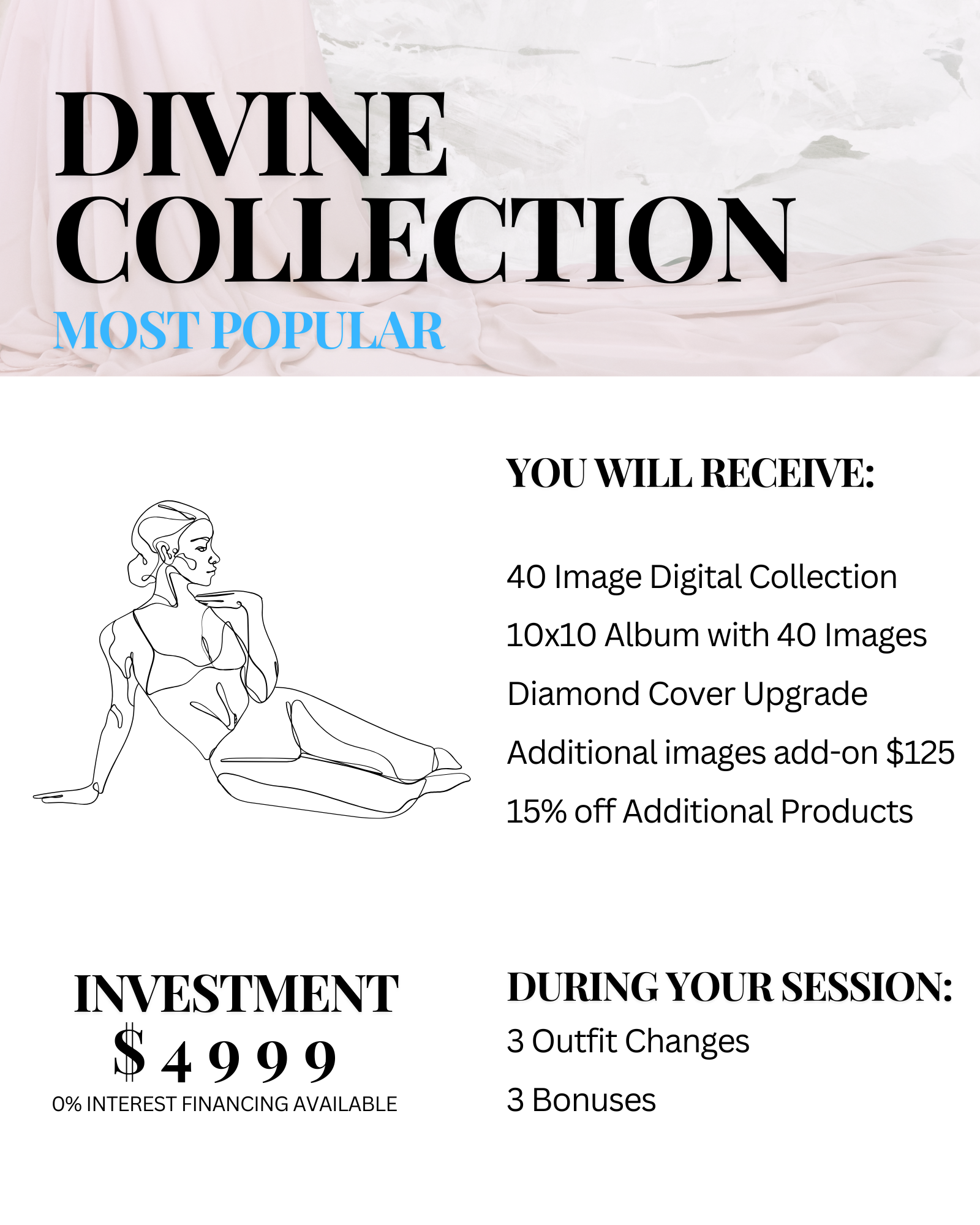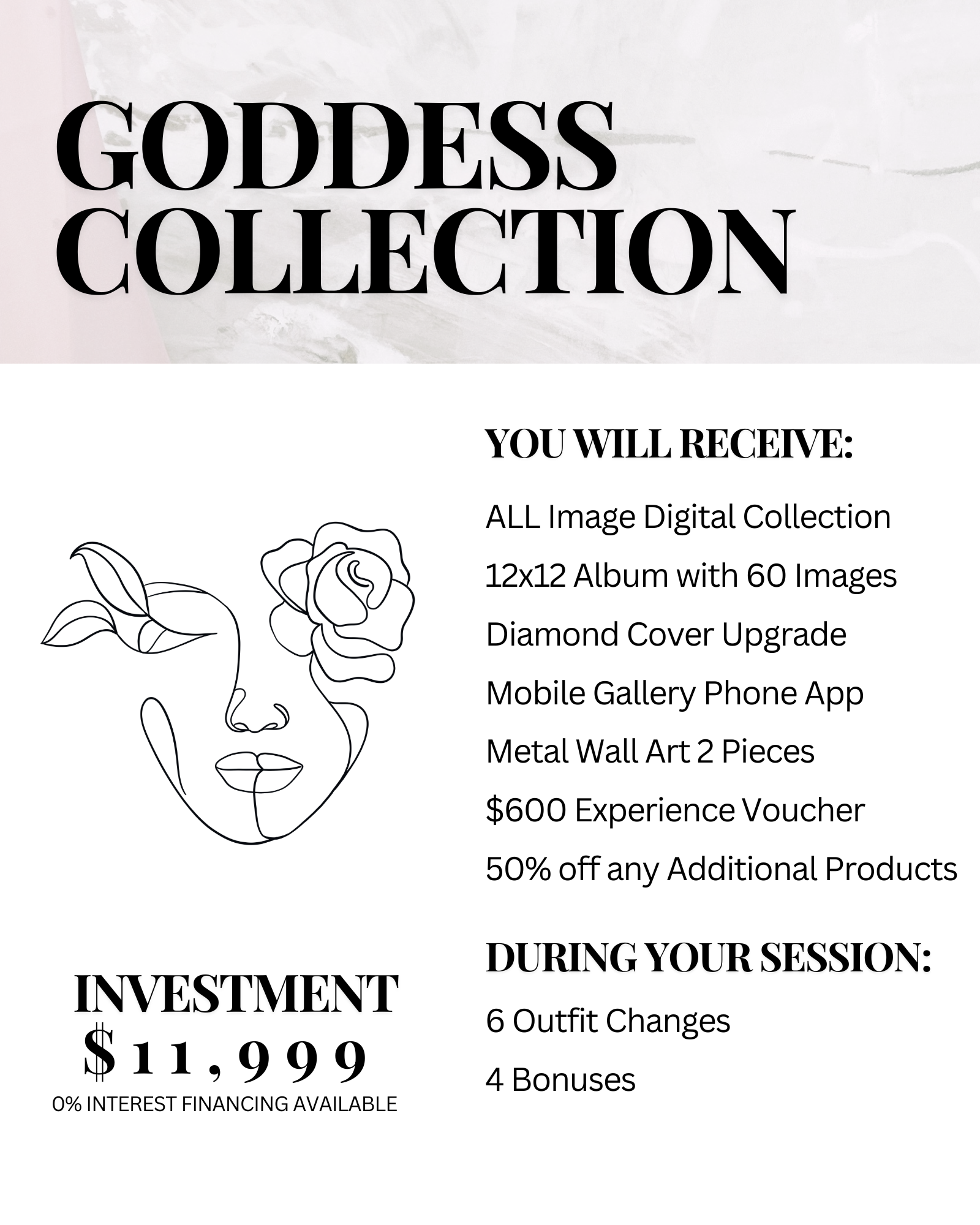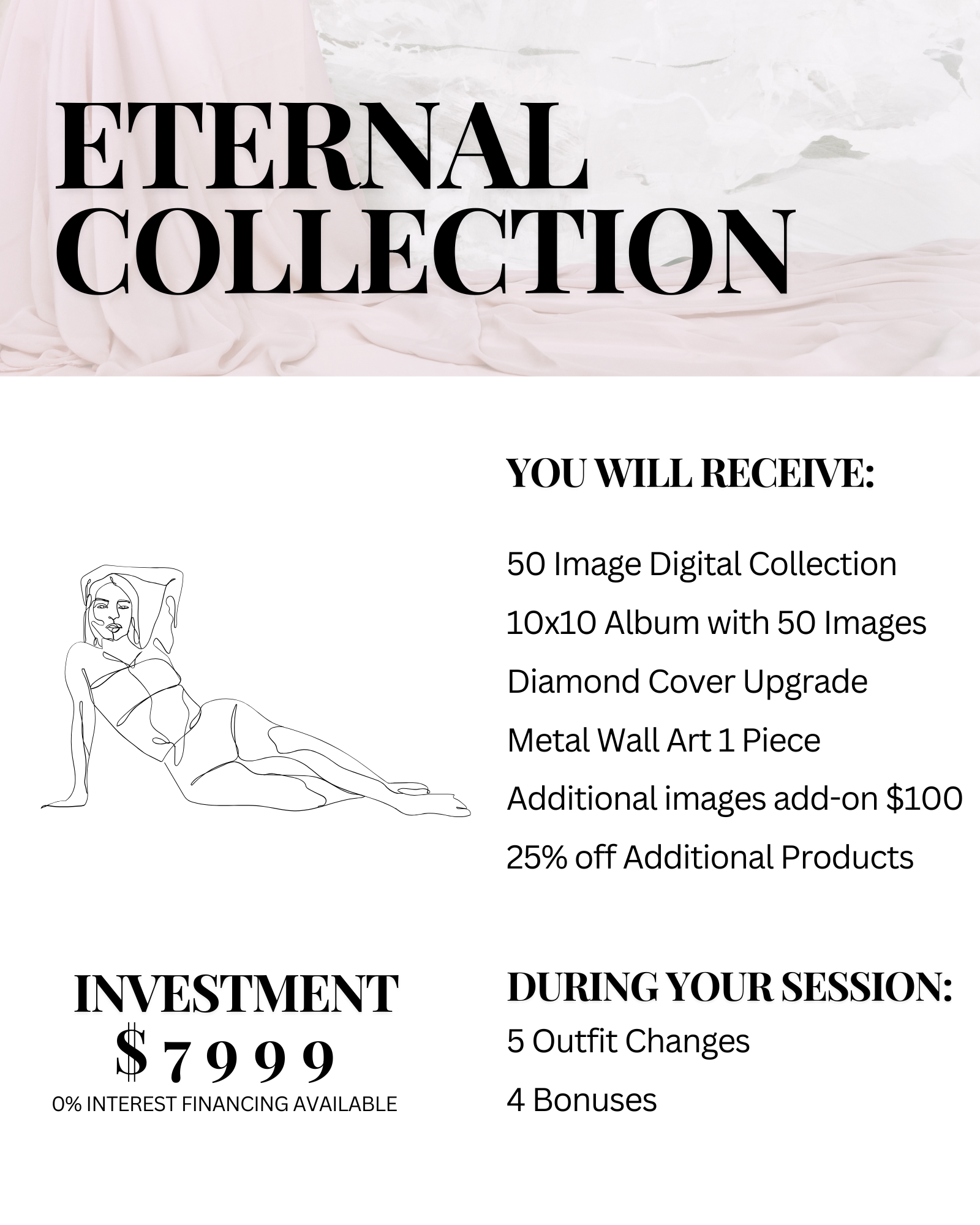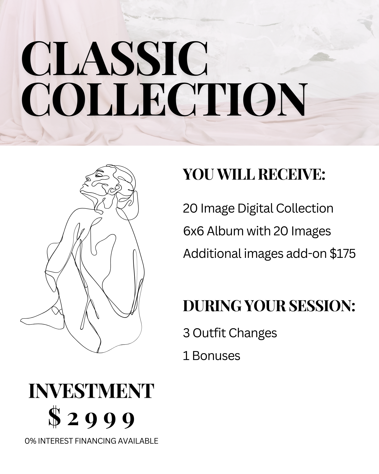 If you choose to pre-purchase one of our 5 Collections, we will include your choice of the following in your Boudoir Experience at no additional cost. To pre-purchase, you may choose to pay in full OR set-up a Pre-payment plan.