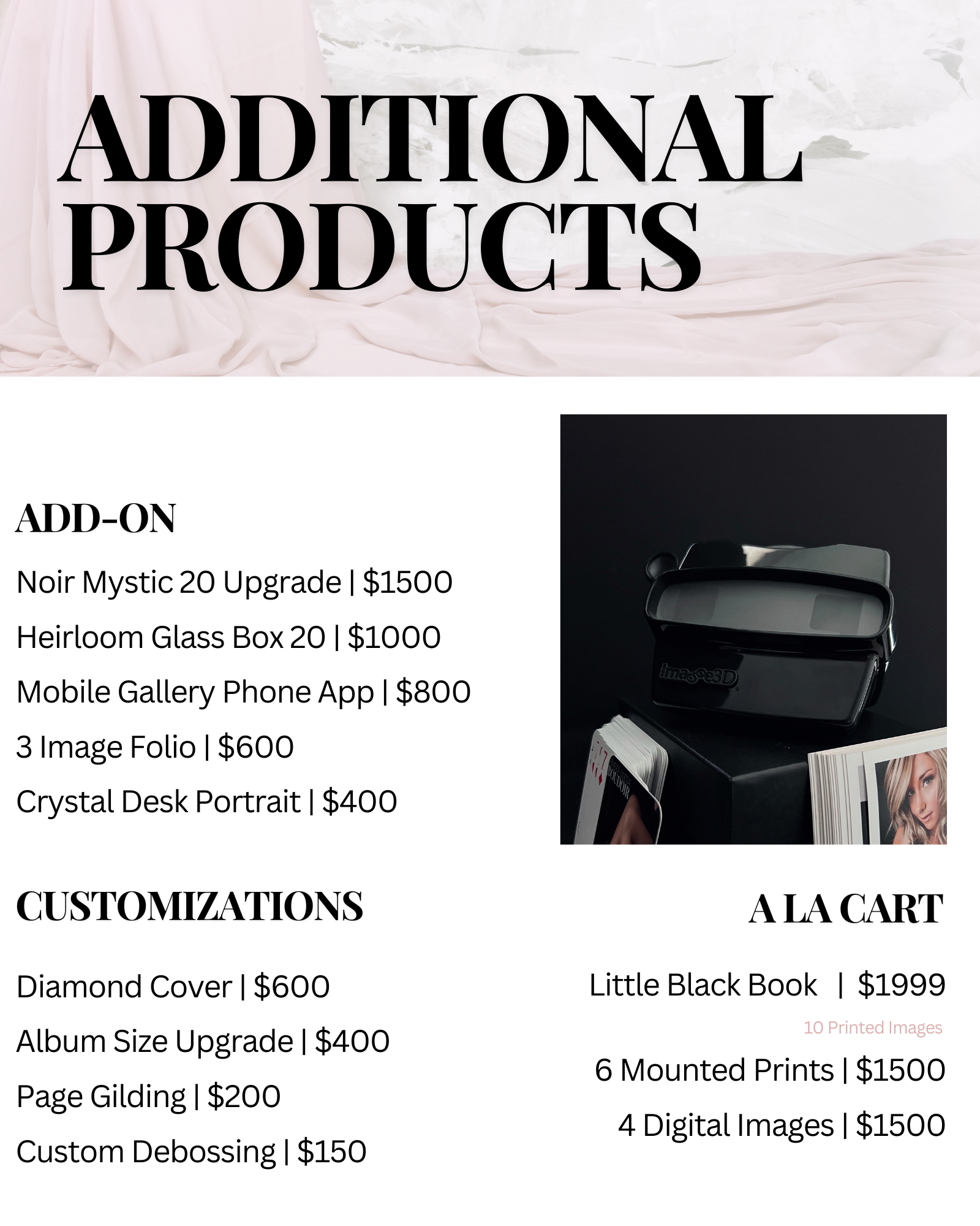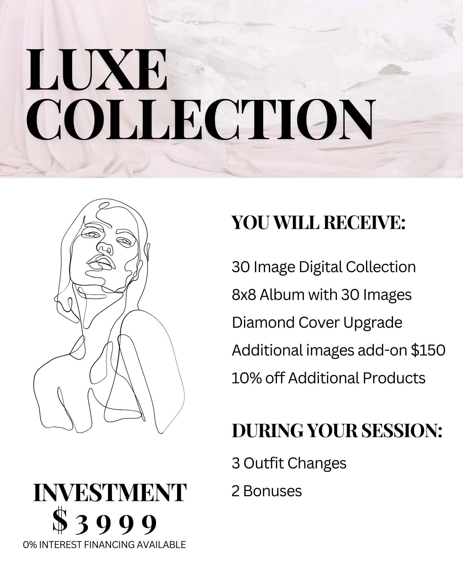 The minimum investment is due within 30 days of booking your photoshoot. When you prepay a collection, it enables you to unlock the following Bonus options that you can choose for FREE! Some of which are valued up to $600 each. You will make your final purchasing decisions the day of your ordering appointment.